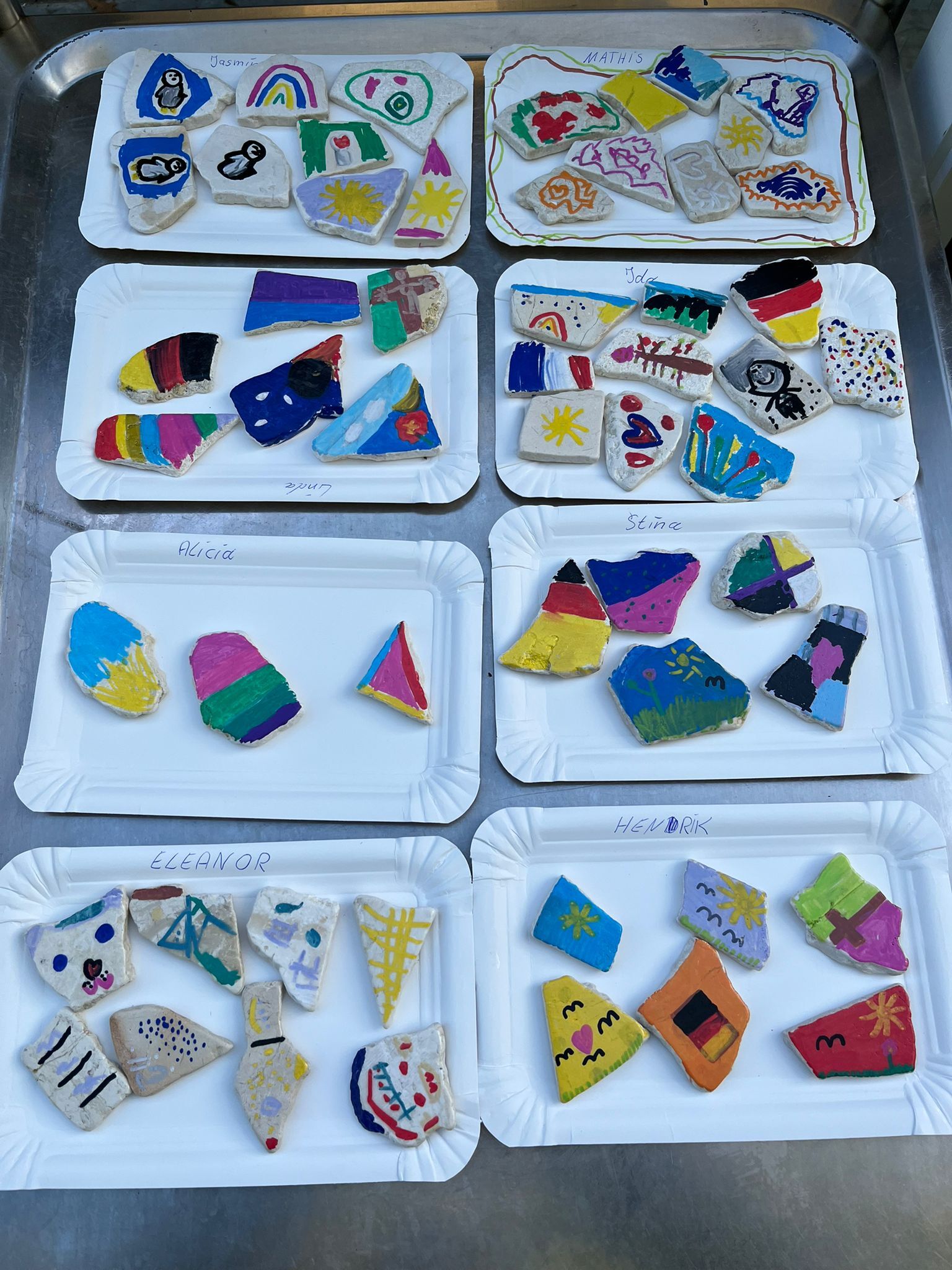 An den etwas ungemütlicheren Tage wurde es vor allem in unserem Bastelraum lebhaft. Wir haben Kastanien-Fledermäuse, Eulen mit bunten Blätterfedern und kleine Igel mit Kastaniennasen gebastelt. Außerdem entstanden ein eigenes Herbst-Wurfspiel aus Bechern, viele hübsche Armbänder und selbst bemalte Glückssteine.