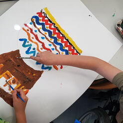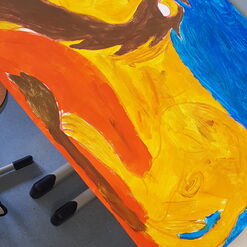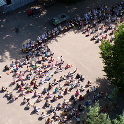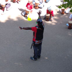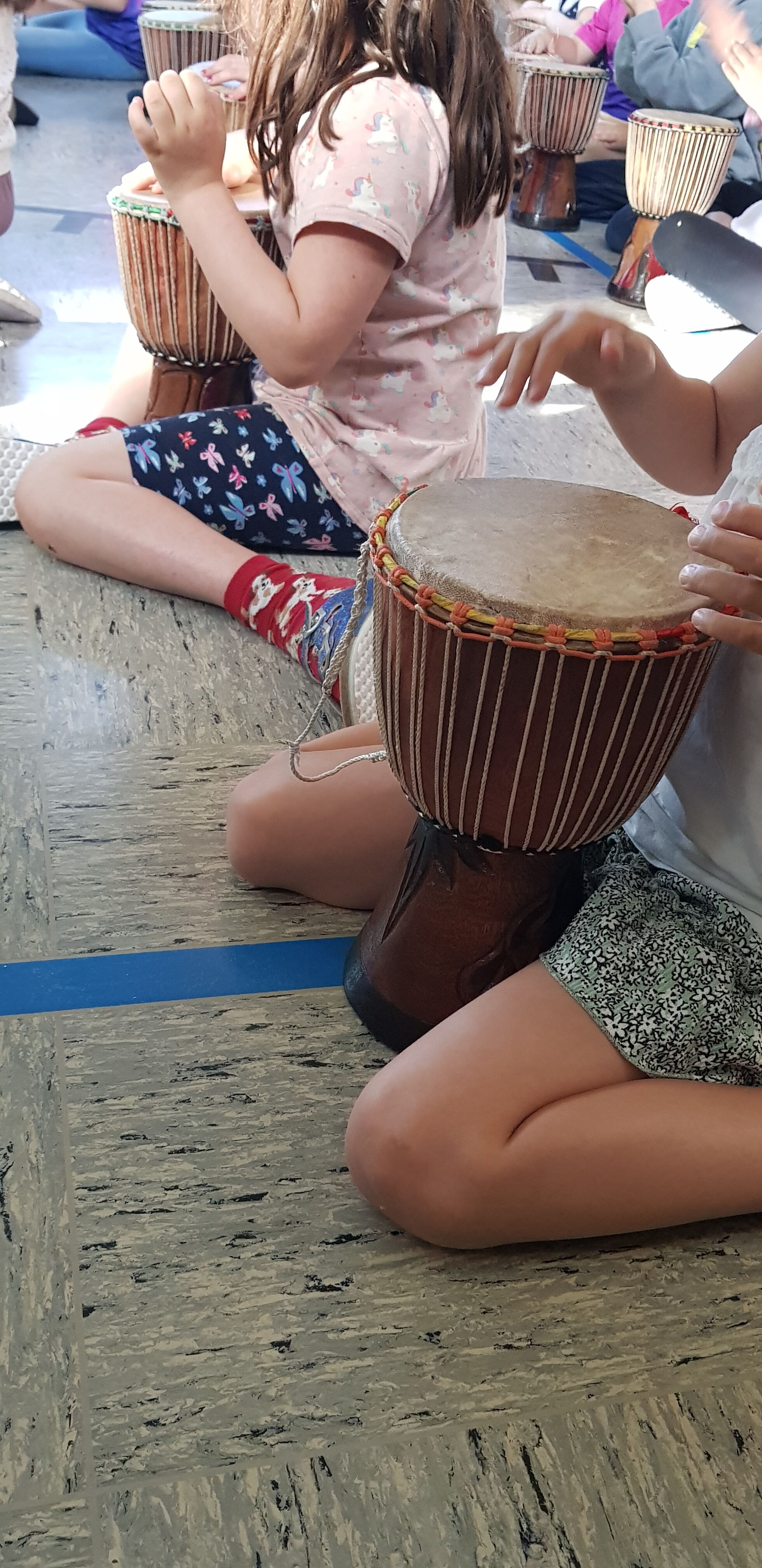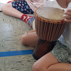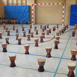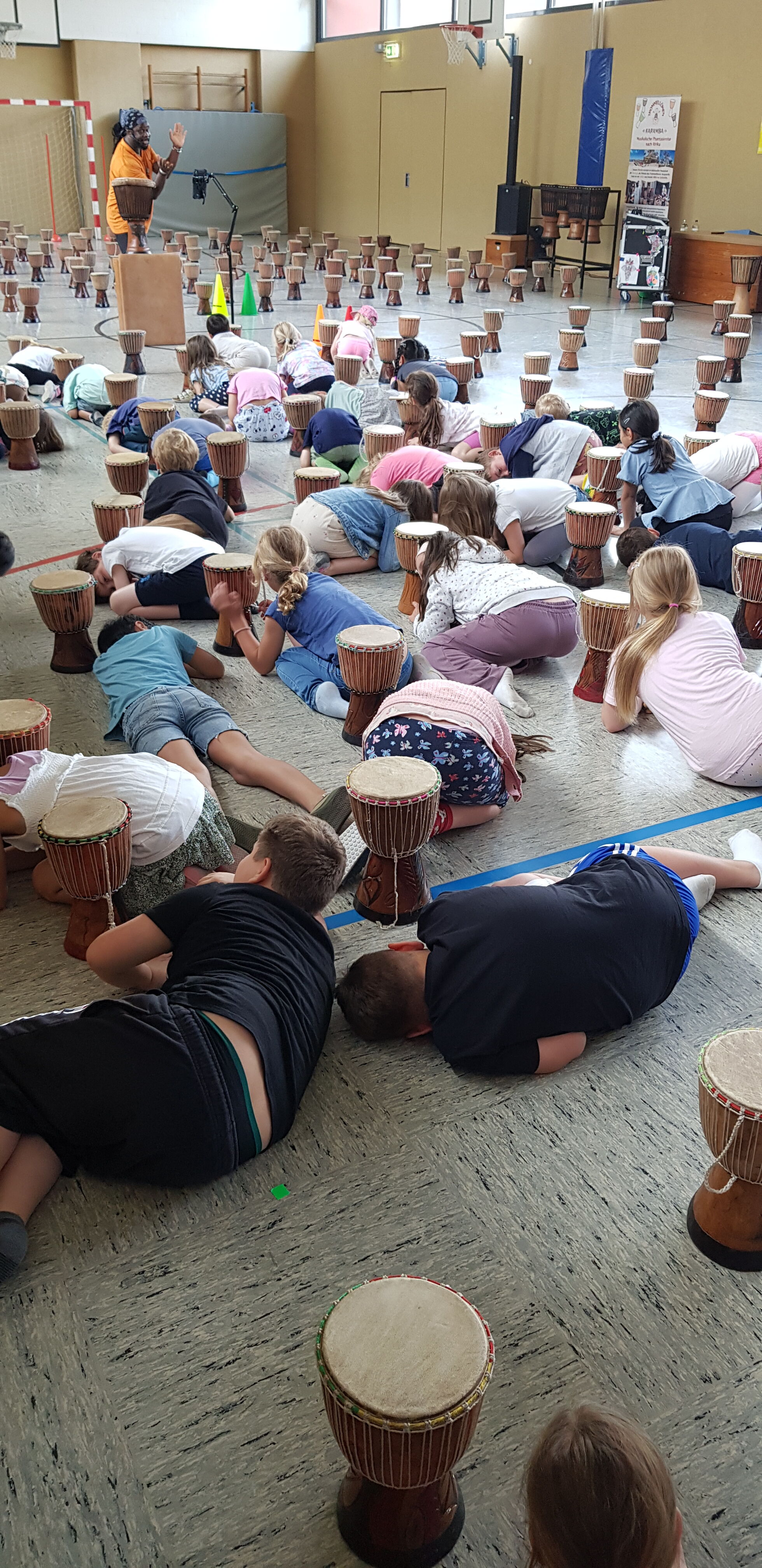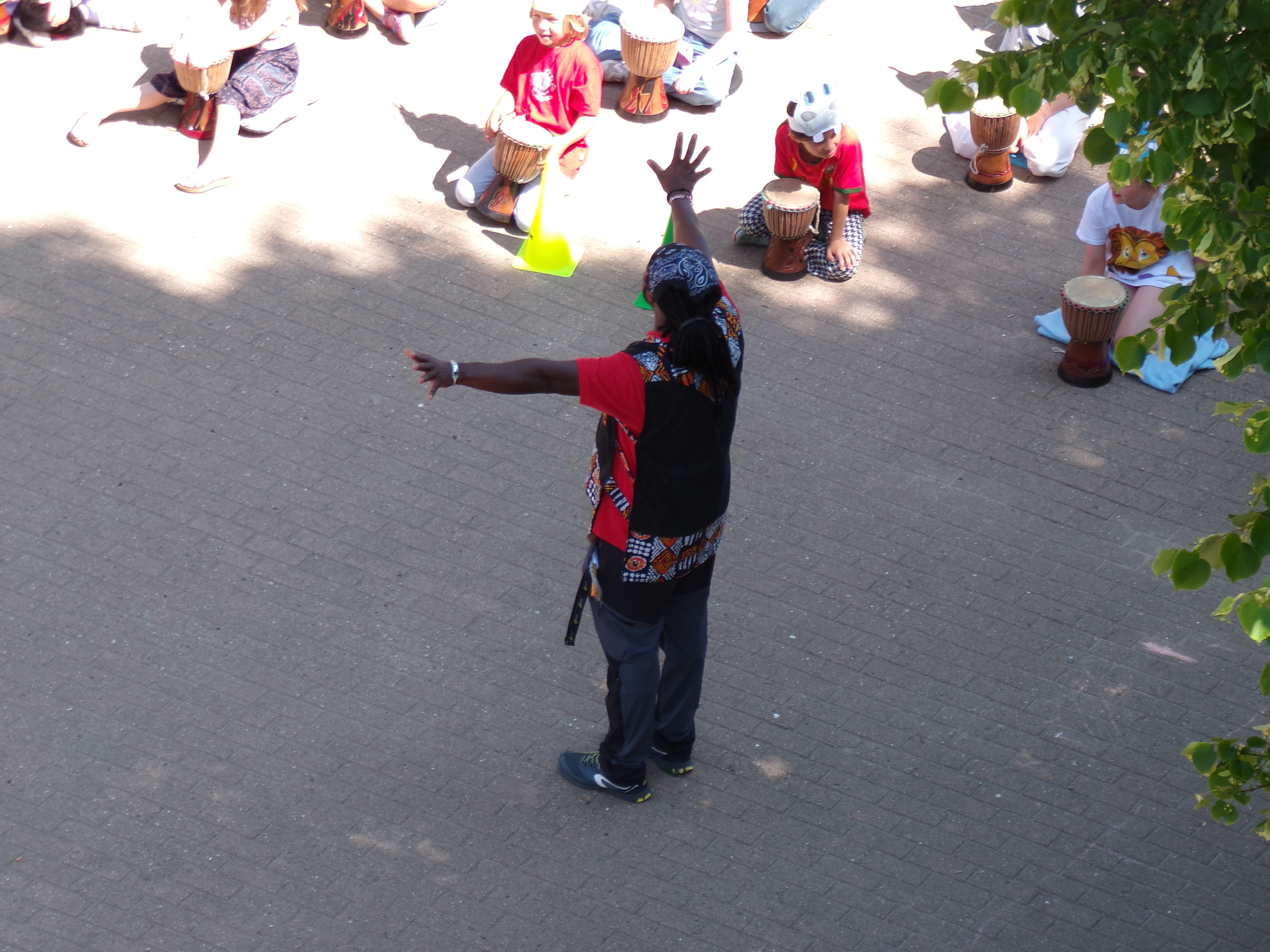 Hier lernten wir verschiedene Trommelrhythmen und Teile von Babas Liedern. Auch durften je Jahrgang einzelne Kinder spontan eigene Trommelrhythmen vorspielen, die wir alle nachmachen sollten. Diese Stunde endete immer mit einem gemeinsamen Tanz und danach gingen viele schon singend in ihre Klassen.