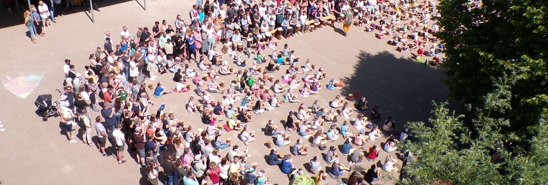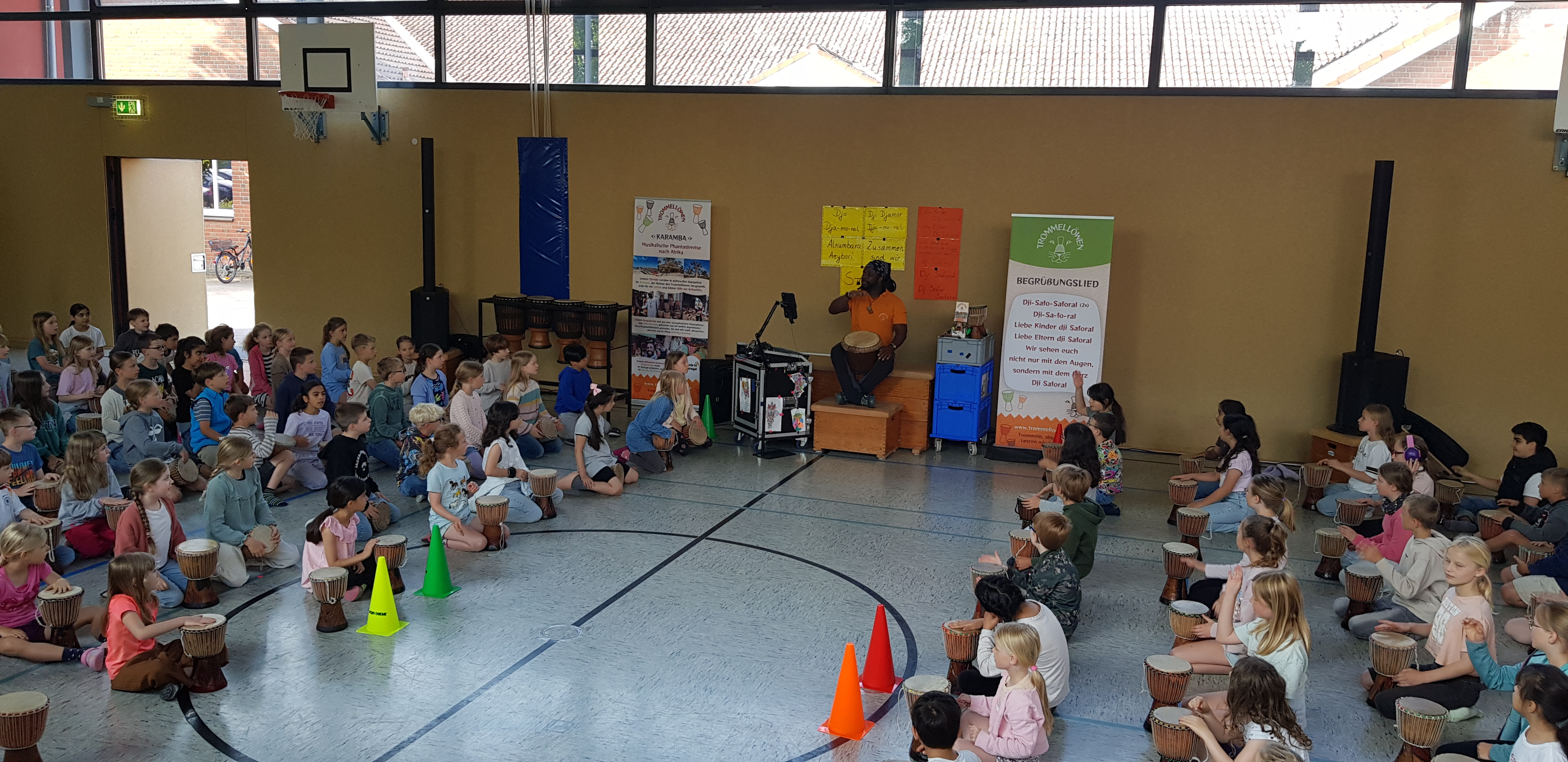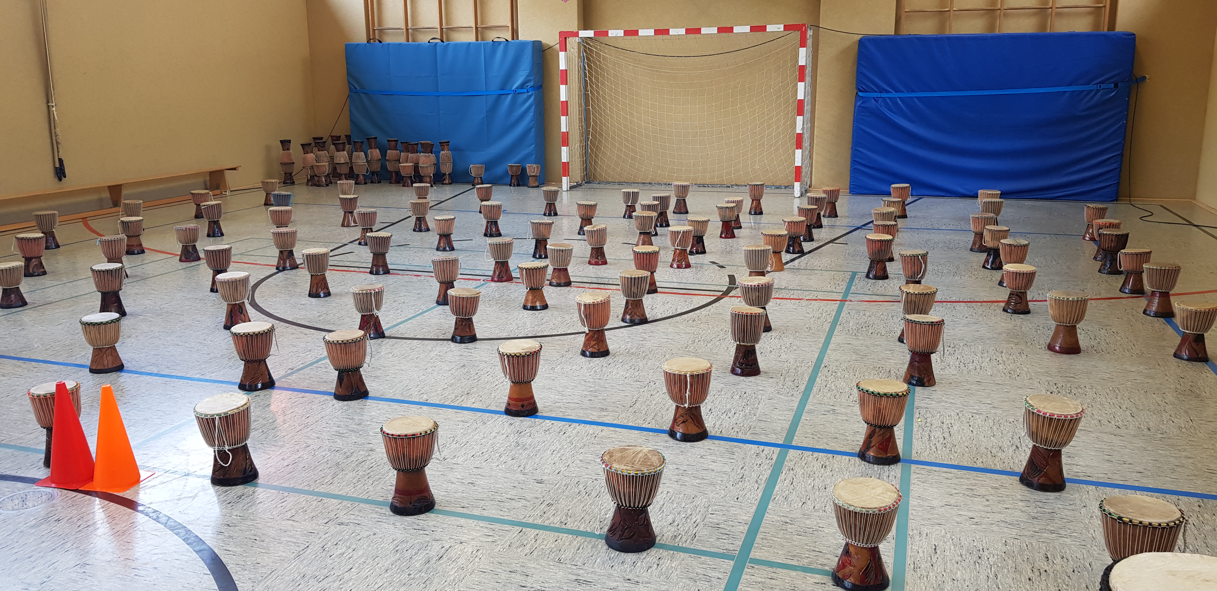 So begann jeder Tag in dieser Woche mit einem Begrüßungstrommeln der gesamten Schule in der Turnhalle.