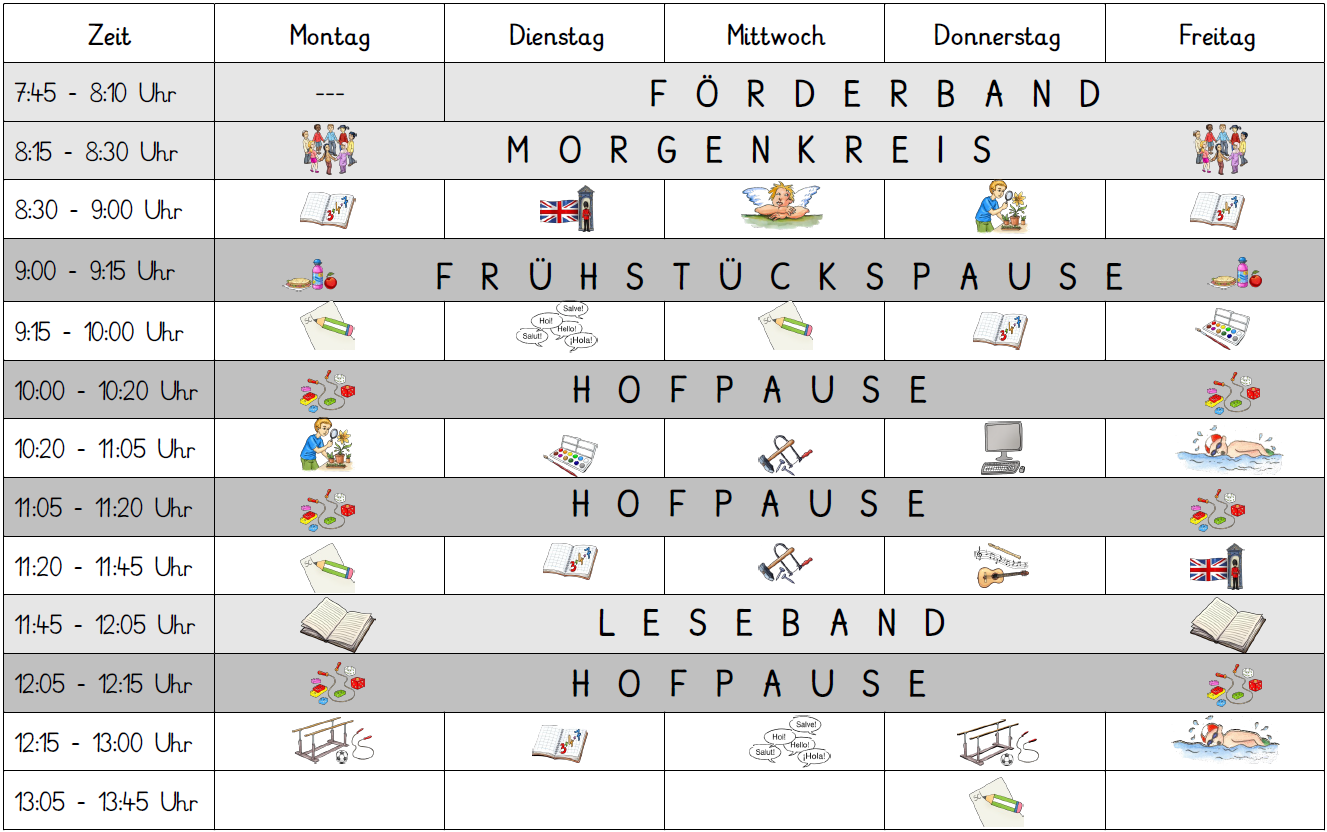 Der Unterrichtstag beginnt für alle Klassen regulär um 8:15 Uhr. In einer frühen Stunden um 7:45 Uhr können Förderstunden stattfinden.