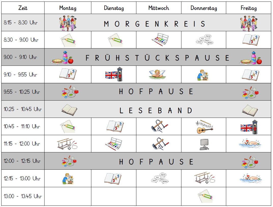 Der Unterrichtsvormittag ist für die ersten und zweiten Klassen in der Regel nach der 4. Stunde, um 12:15 Uhr beenet, für die dritten und vierten Klassen um 13:00. An einem Tag in der Woche haben die Klassen jeweils eine Stunde länger Unterricht.